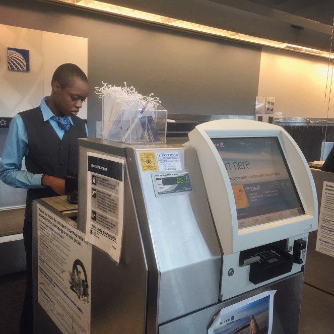Vi skulle ha flugit med United Airlines till Newark så vi går till Uniteds incheckningsdisk. Tjejen som står där är mycket ung. Hon vet inte så mycket. Flygen är inställda ikväll. Kanske imorgon också. Det ska visst bero på dåligt väder i New York. Vi kommer att bli ombokade till flyg under morgondagen. Som kanske inte heller går. Några ersättningsbussar kommer inte sättas in. Någon hjälp att ordna transport kan vi inte få. Vi ber att få tala med chefen. Hon kan komma om en halvtimme. Under tiden får jag prata med en representant från United på telefon.