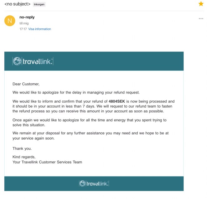 Nu har jag fått ett mejl. Men något kvitto på transaktionen innehåller det inte. Bara en ursäkt och en ny tidsfrist. Den här gången ska pengarna ha kommit inom sju nya dagar.