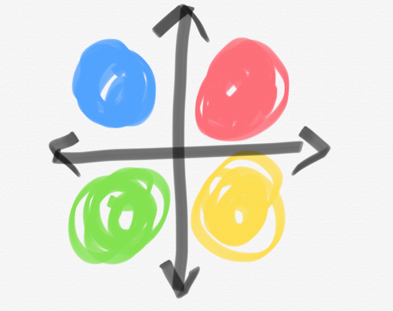 Istället för fyra cirklar i olika färger får vi i så fall sexton rumsklot i rumstiden som alla har olika färger. Men då blir så klart bilden genast mer komplex. Eller så skulle vi kunna utgår ifrån bokens fyra färger och bestämma oss för att det är extroversion som vi har på x-axeln och låta driv vara en egen dimension så att de med mycket driv blir ”framtida” och de mer passiva ”dåtida”. Vi skulle sedan kunna lägga till dimensionen optimism/pessimism som två olika djur. Låt oss säga fjäril och bi. Då kan vi också kombinera ihop 16 olika personligheter: Röda, framtida fjärilar kan möta gröna dåtida bin men också gröna dåtida fjärilar och gula framtida bin och så vidare. Mer komplicerat men mer komplett.