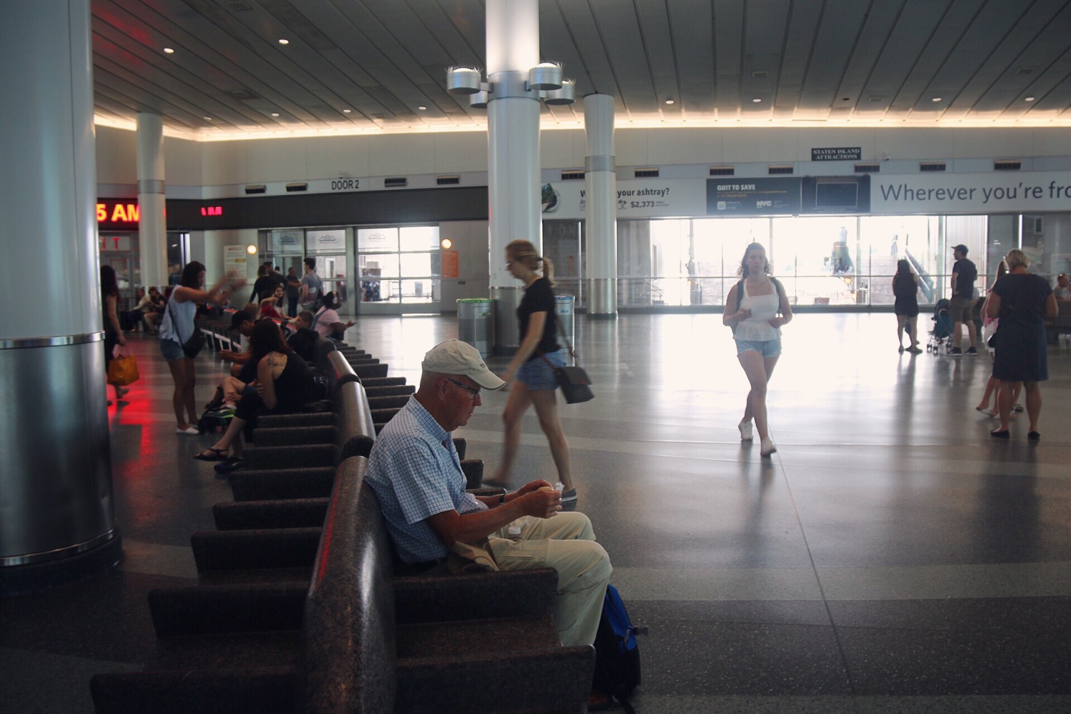 Dörrarna som leder in till avgångshallen är tydligt utmärkt med stora bostäver som säger ”Staten Island Ferry”. Väl inne är det stort och rymligt och här finns flera alternativ för den som vill köpa något att äta och dricka innan avgång. Här finns också gott om sittplatser och bra toaletter. Stora skyltar kommunicerar avgångstider och annat.