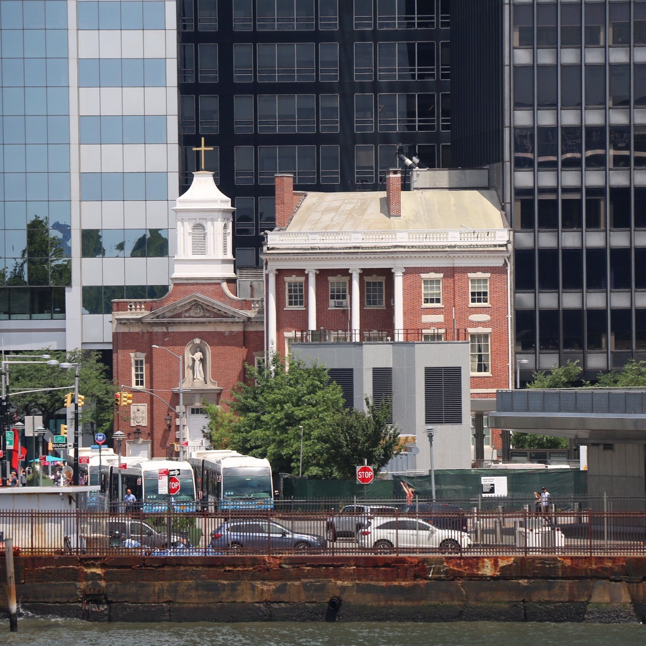 Båten börjar med att gå rakt söderut en liten bit innan den svänger av mot sydväst. Det är nu som du får syn på den lilla söta kyrkan som står framför tre skyskrapor steax bakom färjeterminalen. Det är en katolsk kyrka som innehåller kvarlevorna efter helgonförklarade Elizabeth Ann Bayley Seton, som grundade USA:s första katolska skola för flickor.