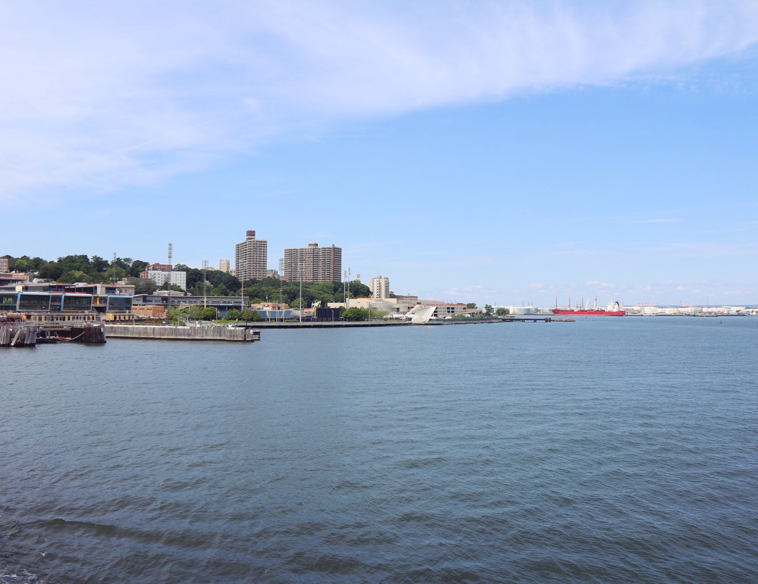 Det är bara att erkänna. När du har åkt någonstans mellan en tredjedel och halva resvägen är det mest spännande över. Men det hindrar inte att det kan vara rogivande att titta på båtliv, hamnkranar och ett par golfbanor i New Jersey, som båten passerar innan den lägger till vid St George färjeterminal på Staten Island.