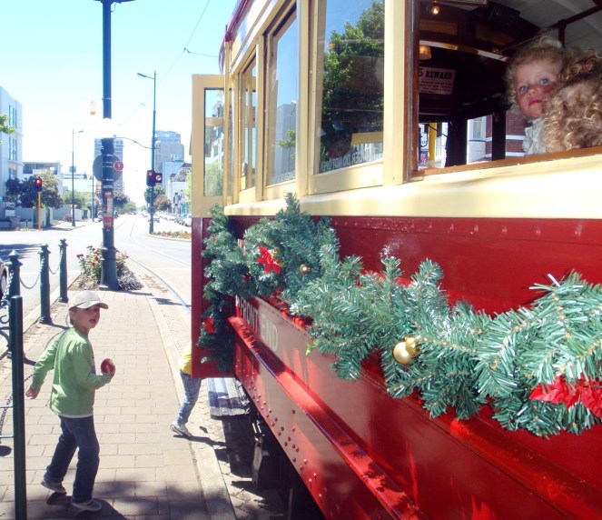 Anton vid en spårvagn som Albin kliver på. Christchurch den 2 december 2008.