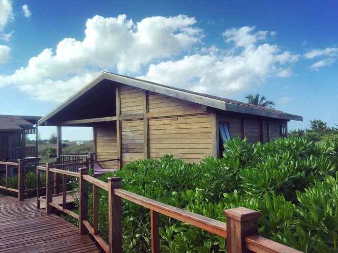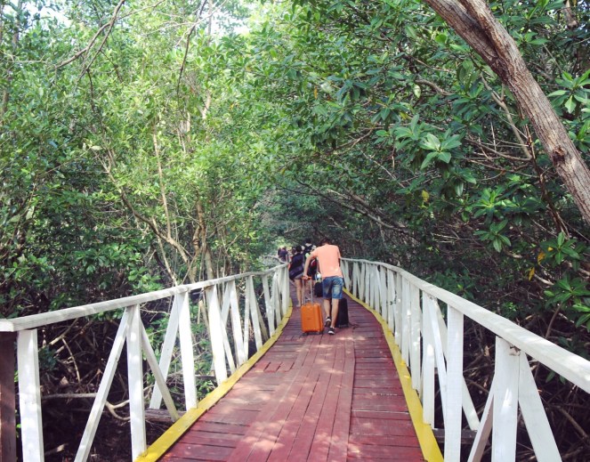 Du anländer till öns södra sida som består av mangrove och går sedan över en träbrygga genom mangrove-skogen till hotellets lobby och vidare ut på stranden.