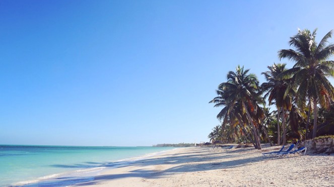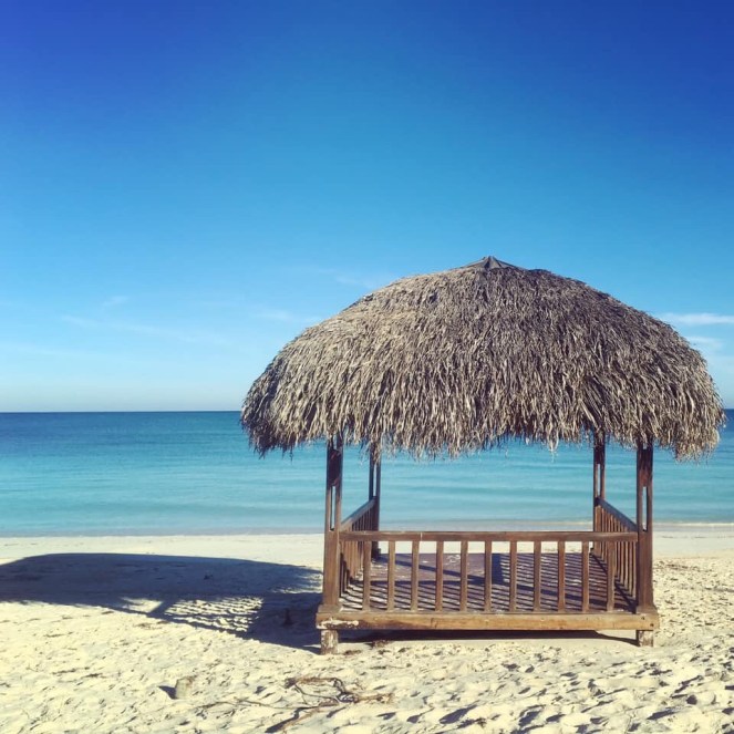Turkost vatten är det bara på norra sidan av ön, men på södra sidan – här längst ut i öster, där de förfallna soltaken är, har du utblickar mot bergen inne på den stora ön – Kuba.
