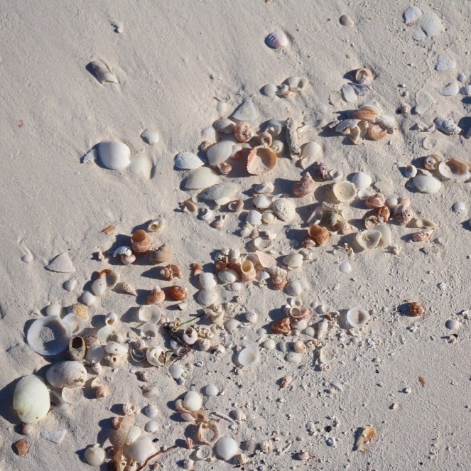 Snäckor och delar av snäckor finns det en hel del på stranden och några på botten botten men annars är sanden len och skön att gå på. Att doppa sig så här i januari är svalkande men inte kallt. Behaglig badtemperatur.