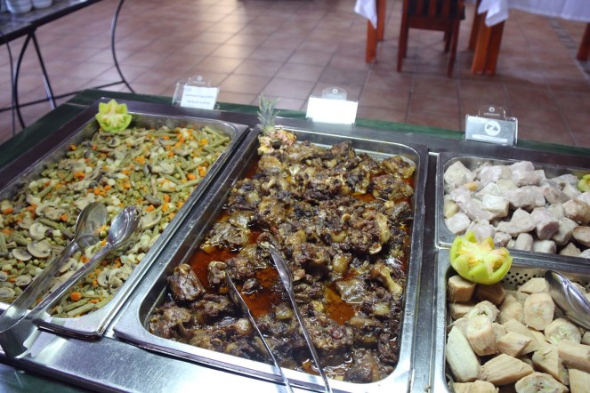 Alla måltider som serveras i den stora matsalen är buffé. Frukost lunch och middag. Mest kantin-mat. Det finns ett antal rätter att välja på men det är inget överdåd. Ingen måltid är den andra exakt lik men många rätter återkommer flera gånger. Några gånger serveras nötkött i form av gryta som liknar kallopps. Griskött finns nästan vid varje måltid. Ofta som rökt kött. Kyckling och fisk finns också oftast. Någon gång köttbullar och någon gång hamburgare som ser lite skumma ut. Och alltid frukt. Oftast flera sorters färsk frukt. Och några grönsaker. Nyårsbuffén är lite extra och där finns både helstekt gris och helstekt kalkon och en helstekt stor jättefisk och tårta utöver det vanliga.