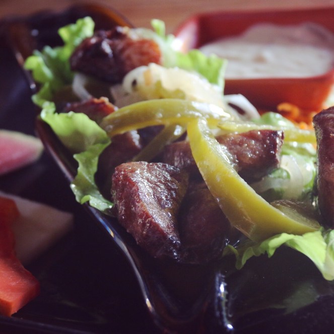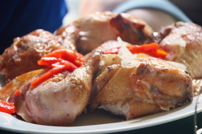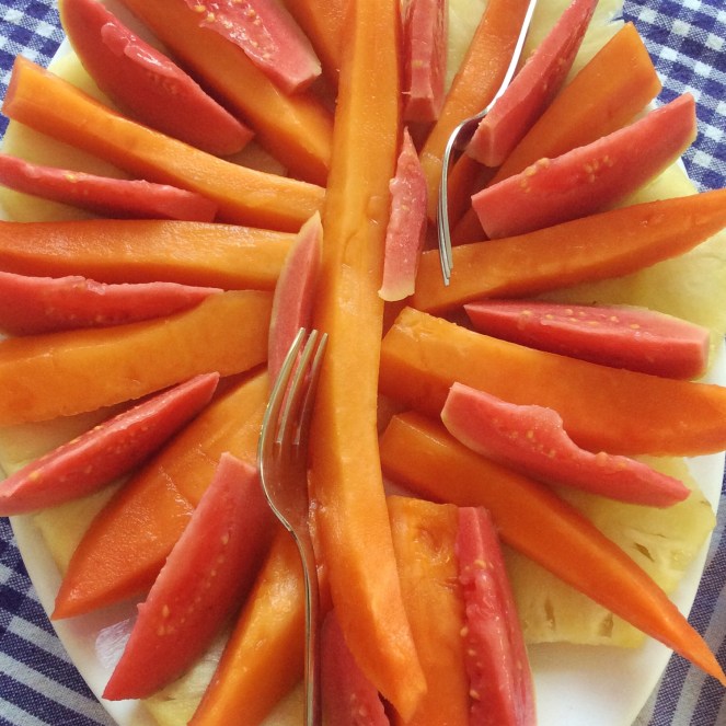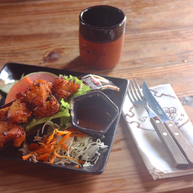 Maten kostar 13 cuc per person. Det är lite myggigt på platsen som annars är mysig med fin växtlighet och fågelsång. Och en söt hundvalp. Maten är sådär. Den färska frukten smakar gott men vi får på tok för mycket kyckling och riset med rökt griskött smakar ungefär som en askkopp luktar. Inte särskilt gott med andra ord. Många som har kommenterat platsen på TripAdvisor tycker att det är en turistfälla och det är det kanske, men eftersom vi inte förväntat oss mer än en en restaurang tyckte jag ändå att det här var lite kul. Men den verkliga behållningen av dagen är vandringen hit och härifrån.