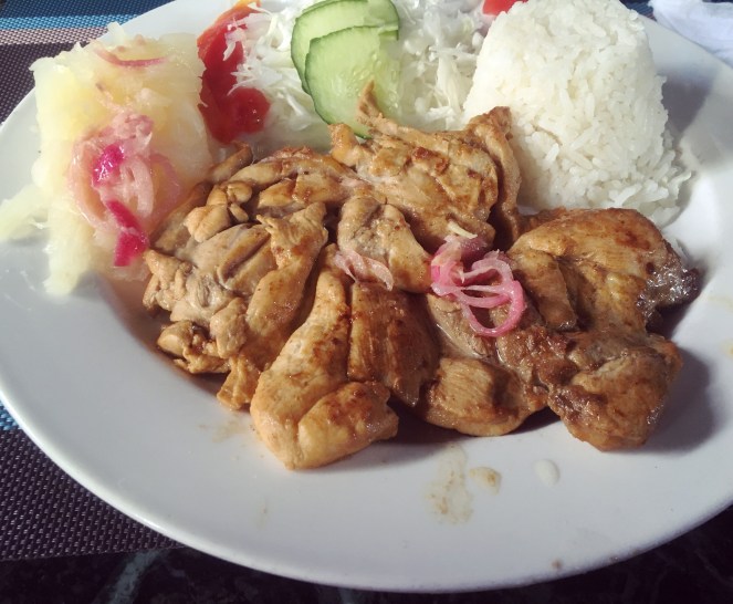 På väg i en taxi mellan Cienfuegos och Viñales. Inte långt från flygplatsen i Havanna ber jag vår taxichaufför se ut något ställe där vi kan äta. Han förstår inte engelska så jag mimar att jag äter. En liten stund senare stannar han vid en restaurang som heter Los Kcharritos. Där äter vi stekt kyckling med vitt ris. Vi bjuder chauffören på maten.