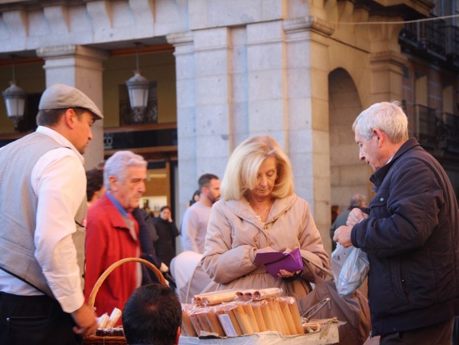 På torget pågår handel med någon slags hårt rullat bröd. Kanske är det bakverk? Jag funderar på om de är typiska för årstiden, för Madrid eller för båda samtidigt?