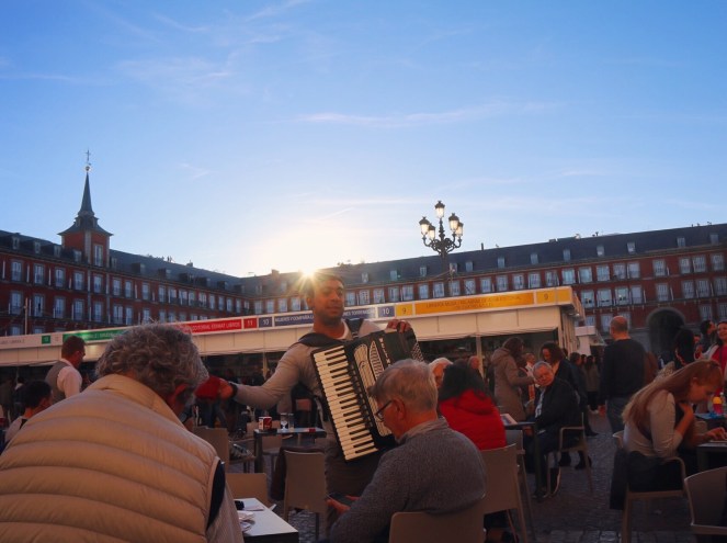Vi befinner oss i Madrid. Det är eftermiddag och vi strosar omkring lite lagom planlöst när vi kommer in på Plaza Mayor. Vi sätter oss ner på ett café och tar en liten paus. Det här är klassisk spansk mark.