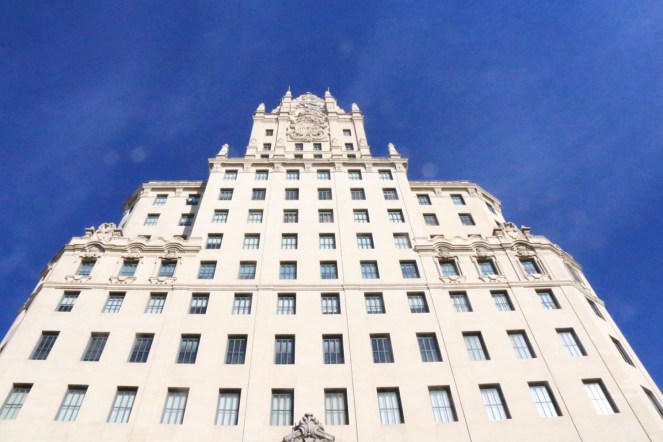 Jag har skrivit förut att den spanska huvudstaden har något newyorkskt över sig. Där finns i alla fall några sådana inslag. Och en av de byggnader som bidrar till det intrycket är den skyskrapa som byggdes för det spanska telefoni-bolaget Telefónica på 1920-talet.