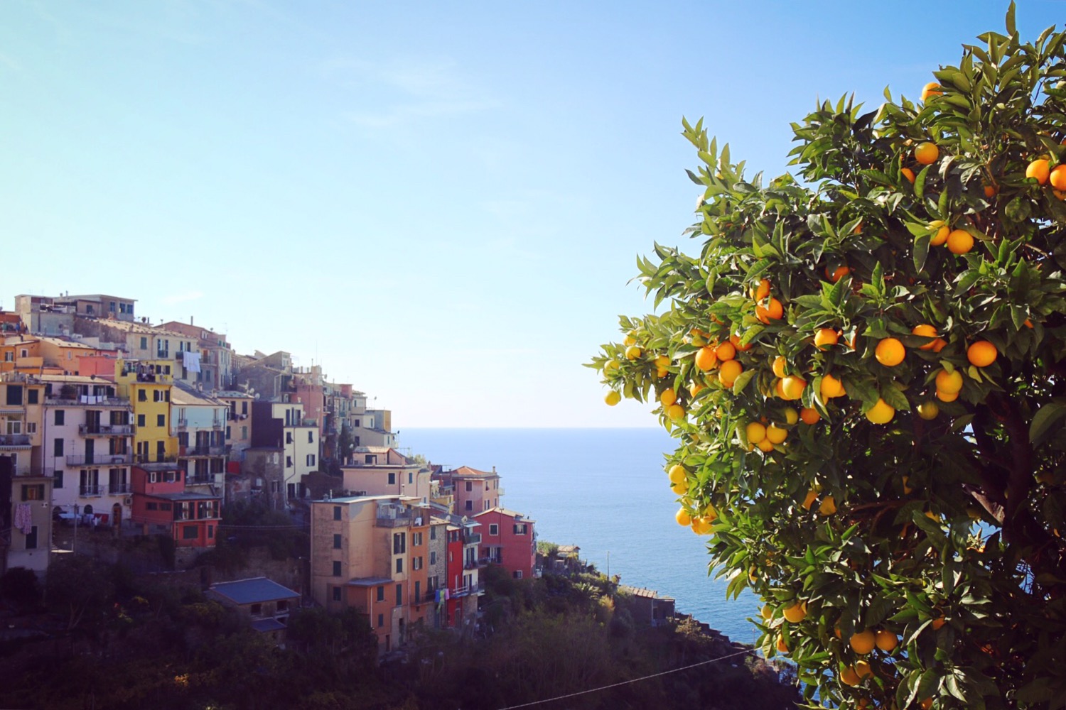 Husen på klipporna ovanför hamnen i Riomaggiore klamrar sig fast på ett alldeles orimligt sätt som trotsade de tyngdlagen fullständigt. Men vem bryr sig om Newtons lagar när en stor strålande apelsin sänker sig i Medelhavet och färgar himlen rosa? Byn är den sydligaste av byarna som räknas till Cinque Terre och även den är alldeles fantastiskt vacker. Inte minst i solnedgången: