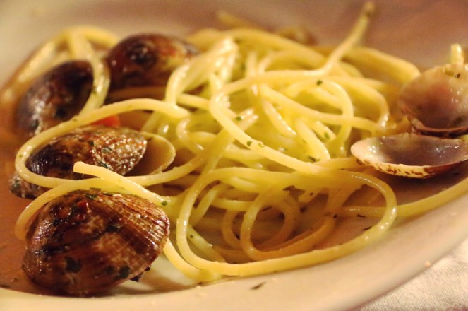 Till kvällsmat den första kvällen åt vi spaghetti vongole på en restaurang vid det lilla torget nere vid havet i Vernazza. Taverna del Capitano som fått 3,6 stjärnor på Google. Vi åt faktiskt exakt samma nästa kväll, så god var pastan med hjärtmusslor. Med smak av vitlök, olivolja och persilja. Efteråt tog vi varsin glass på gelaterian som ligger vid huvudgatan genom byn. Jag valde hallonsmak.