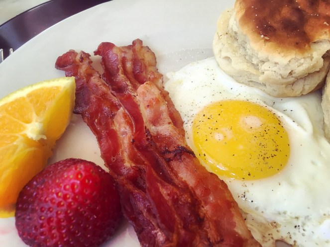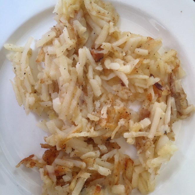 Det är en sak som är skönt med små hotell. Nästan aldrig någon trängsel. Frukostmaten på andra bilden är råstekt potatis. ”Hash Browns”, kallas de.