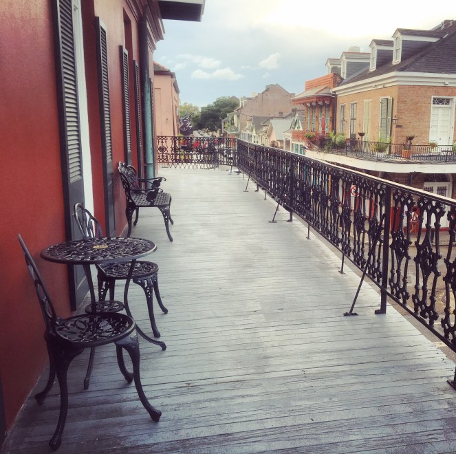I de här delarna är de franska kvarteren mycket lugna. Vårt hotellrum för fyra ligger på andra våningen. Det är mycket häftigt luftkonditionerat. För den som istället vill ha värme finns det en veranda att sitta på utanför rummet. Den löper runt hela andra våningen på hotellet.