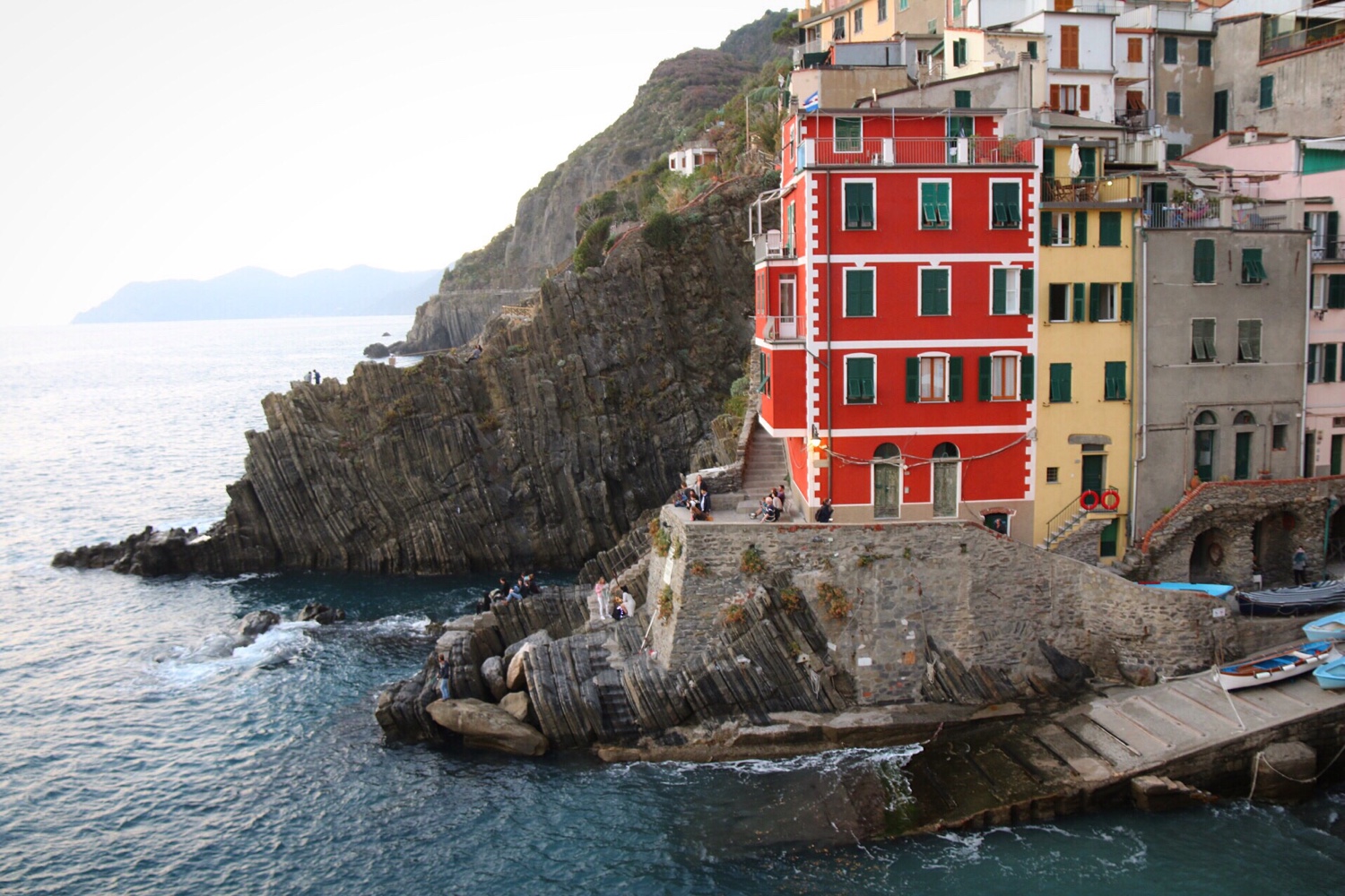 Husen på klipporna ovanför hamnen klamrar sig fast på ett alldeles orimligt sätt som trotsade de tyngdlagen fullständigt. Men vem bryr sig om Newtons lagar när en stor strålande apelsin sänker sig i Medelhavet och färgar himlen rosa? Riomaggiore är den sydligaste av byarna som räknas till Cinque Terre, i norra Italien och den är alldeles fantastiskt vacker. Inte minst i solnedgången.