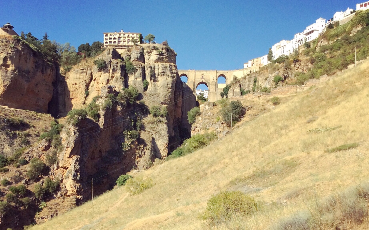 Ronda måste vara småstaden med Andalusiens och kanske hela Spaniens häftigaste läge. Staden delas av en 120 meter djup ravin av kanjon-typ. Platsen ligger 10 mil från Malaga. Husen klänger längst uppe på branterna och där bor 37 000 personer. Runt omkring är det däremot ett glesbefolkat och ganska kuperat landsbygdslandskap.