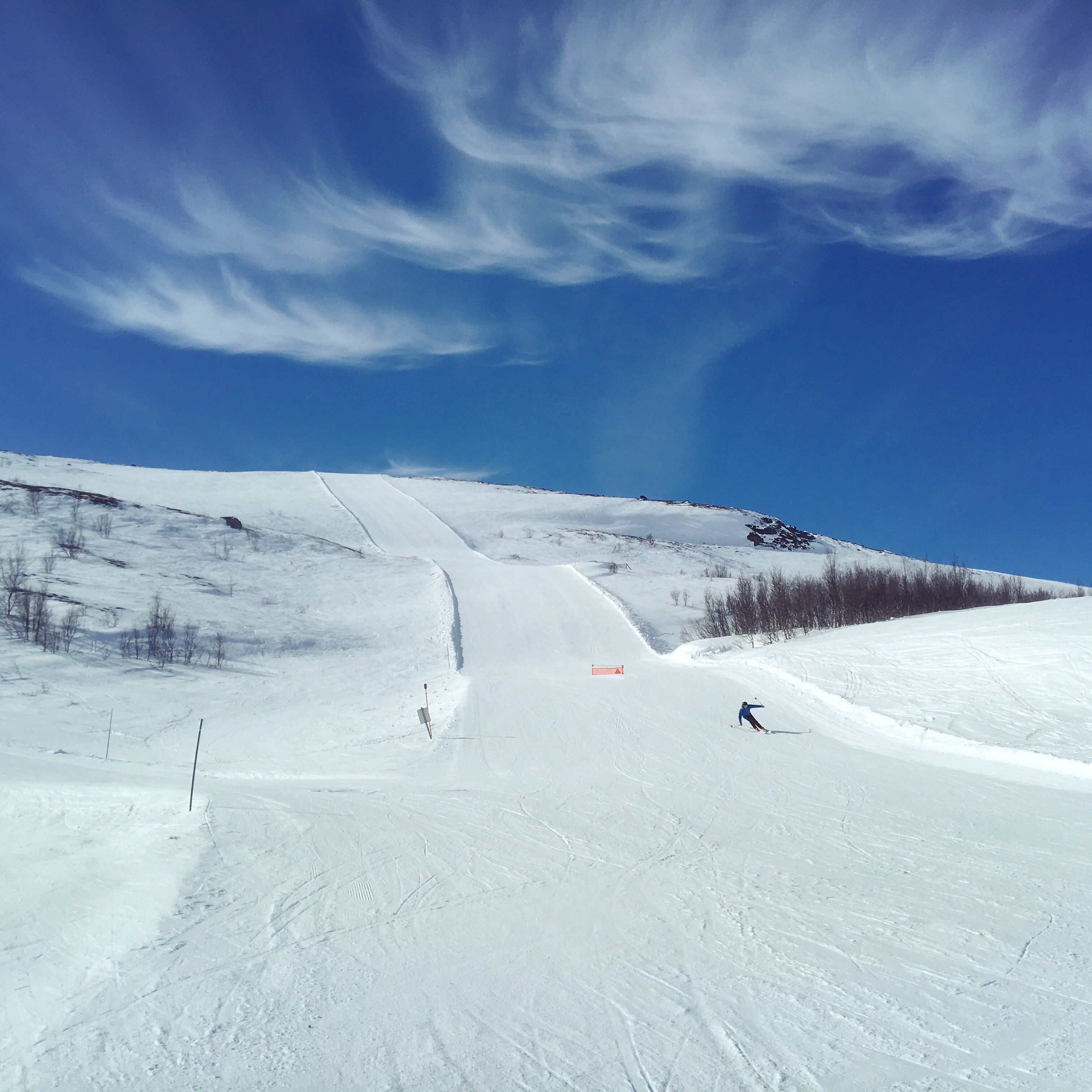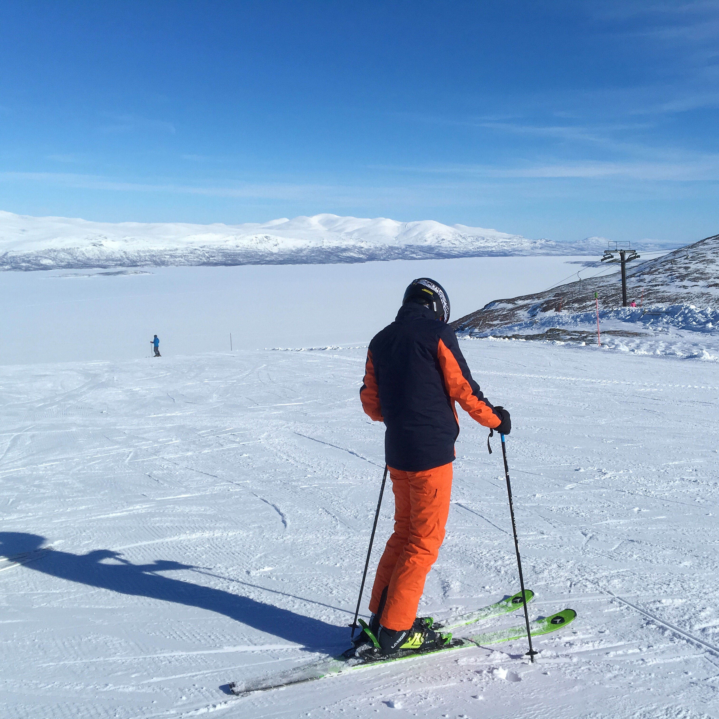 Sol och nästan ingen vind alls. Vilket gjort att det har gått bra att åka i hela liftsystemet, ända upp på kalfjället och ner igen. Att fjället heter Gohpasčorru berättade jag redan igår.