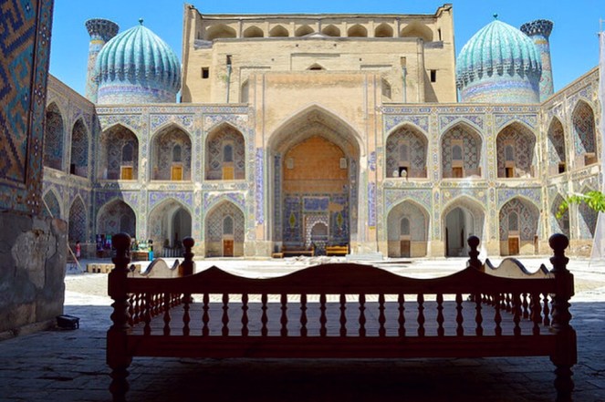 Bilden föreställer Sher-Dor Madrasah (1619-1636). Dåvarande härskaren i Samarkand, Yalangtush Bakhodur, beordrade byggandet av Madrasahs Sher-Dor. Det ska finnas tigermosaiker här med en stigande sol på ryggen, som är intressanta i och med att de trotsar förbudet inom islam att inte avbilda levande varelser på religiösa byggnader. Det ska också finnas lite inflytande från Zoroastrianismen i arkitekturen.