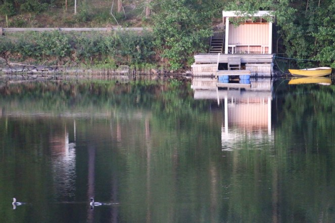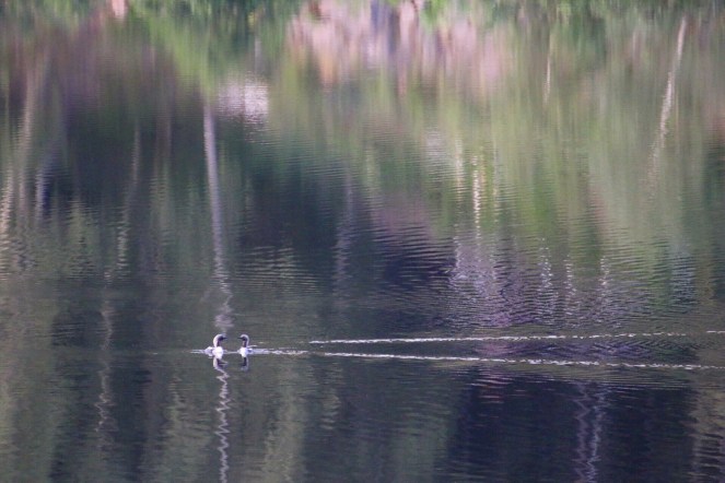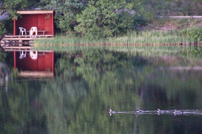 Ibland hörs lommen ropa sorgset över sjön. Och ibland glider hela familjen storlom förbi tyst över vattnet.