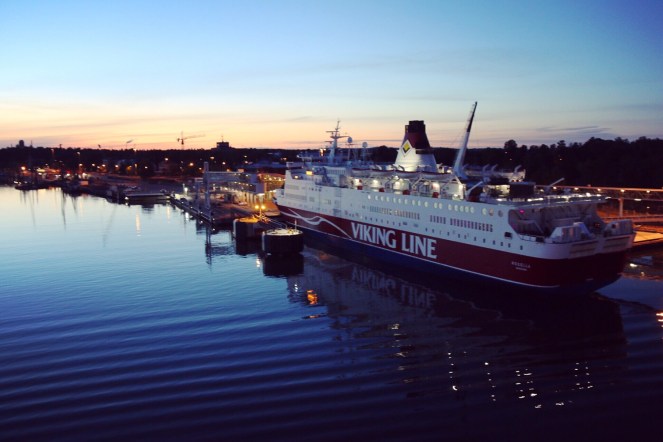 Klockan är midnatt och Åland ser ut ungefär som jag föreställt mig det. Öar och blått hav. Men skymningsljuset målar himlen i varma färger mot norr. Det är blå timmen men ändå mitt i natten. I hamn ligger ännu en färja. Den är från Viking Line. Den vi åker med tillhör Tallink.
