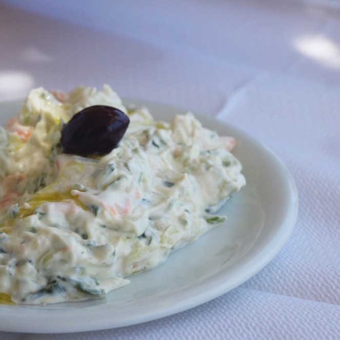 Restaurang Tzi Tzi ligger ungefär mitt ute i ingenting. Utsikten är vacker. På golvet ligger en katt och sover. Vi beställer in tzatziki, en sommarsallad med avokado och mango till att börja med. Tzatzikin innehåller lite riven morot utöver gurkan och smakar som tzatziki ska. Sommarsalladen smakar friskt och gott och är en pigg omväxling till alla grekiska sallader vi ätit den senaste dryga veckan.