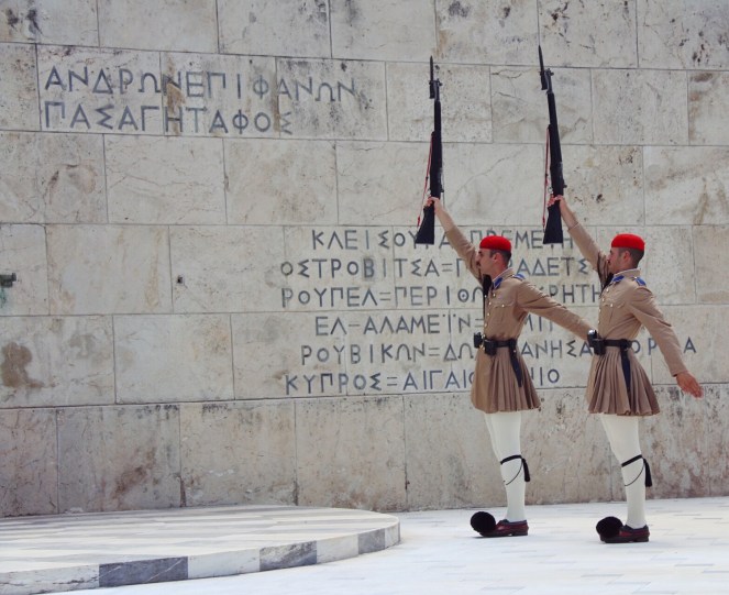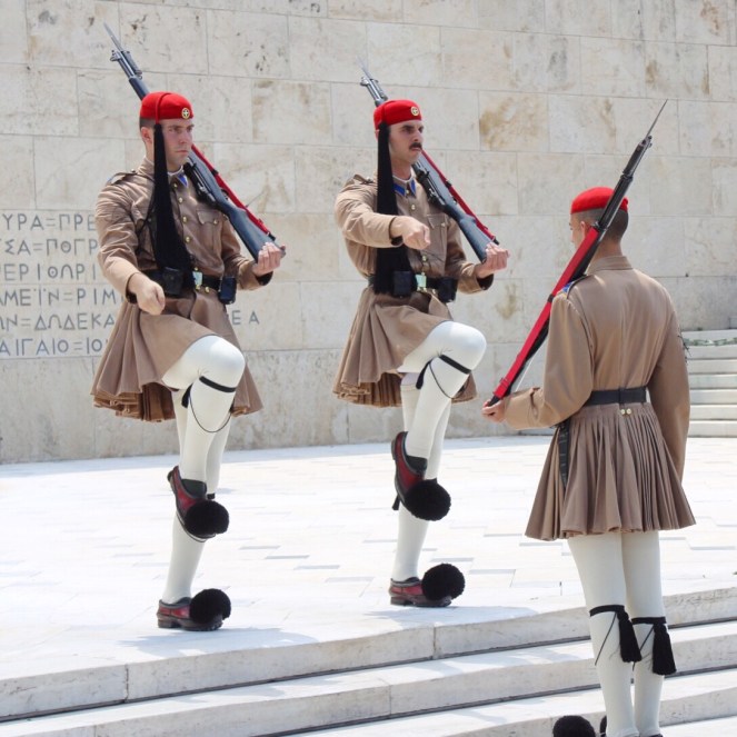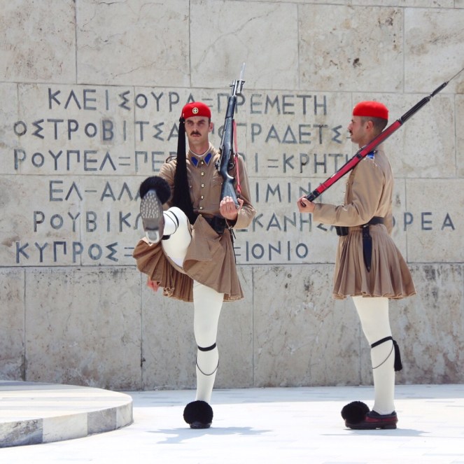 Det var inte alls planerat att vi skulle se det här egentligen. Att vi alls befinner oss utanför Greklands parlament för att se dess berömda vaktavlösning vid den okände soldatens grav, beror på att taxichauffören som körde oss till hotellet föregående kväll tipsade om att det ligger precis vid parlamentet och att den berömda vaktavlösningen kan ses varje heltimme.