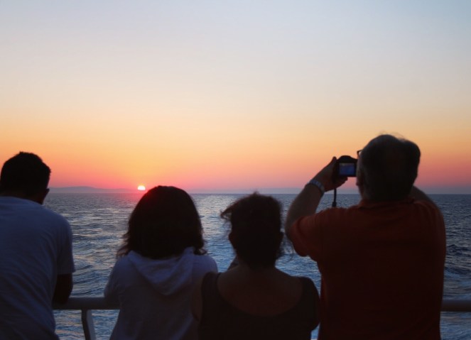 Turister åker färja i Grekland.