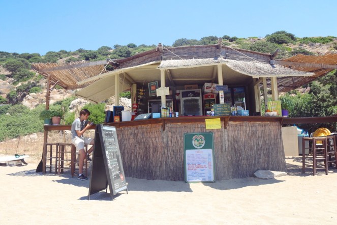 Strandbar på Amorgos i juli i år men före högsäsongen.