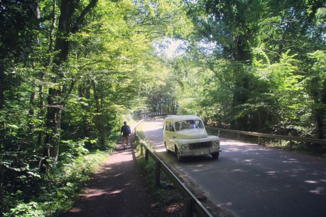 Men faktum är att det ändå var fullt på nationalparkens parkeringsplats när vi kom hit. Vi fick vända om, åka uppför backen, och genom den djungelartade lövskogen igen, för att parkera vid Café Annorlunda. Inget ont som inte har något gott med sig, ändå. Det blev en fikastund där innan vi vandrade ner mot vattnet genom nationalparken.
