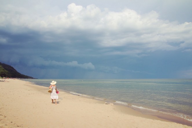 Vi ligger en stund på våra handdukar som vi lagt ut i sanden och torkar i solen. Pratar lite och jag ritar lite i sanden. Sedan går jag en sväng i vattenbrynet, fortfarande i baddräkten innan det är dags att sola ännu en liten stund. Men nu börjar de mörka molnen närma sig från Blekinge. Åskan har hela tiden mullrat på avstånd.