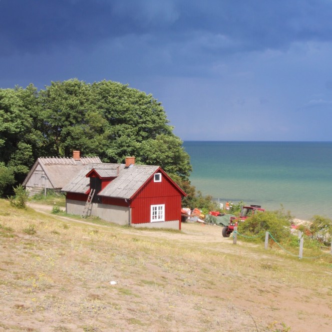 Molnen på himlen, mörka långt bort mot norr och ljusa, höga och bulliga mot söder, gör tillsammans med alla gröna lövträd längs stranden, det lätt turkosa vattnet och det lummiga ”huvudet” att platsen påminner mer om tropikerna än både Sverige eller Medelhavet ändå.
