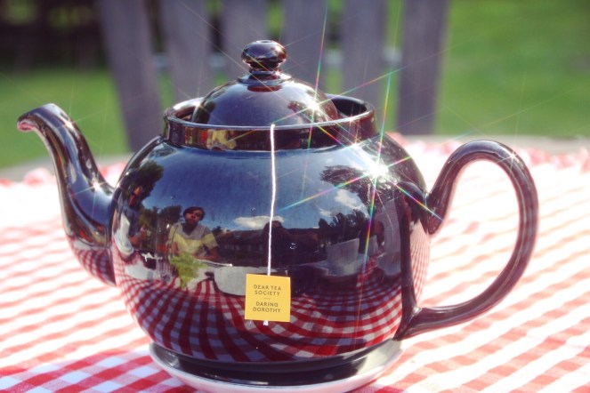 Det ser verkligen mysigt och inbjudande ut, härligt med alla växter. Det är väl röd solhatt som flugan vilar på och fjärilen är en av de där vitfjärilarna som liknar varandra: Raps-, kål- och rovfjäril. Jag tror att det är en rovfjäril. Rov- som i rova då, jag associerade länge till rovfåglar och rovdjur. Fint bildreportage och roligt med speglingen i tekannan!