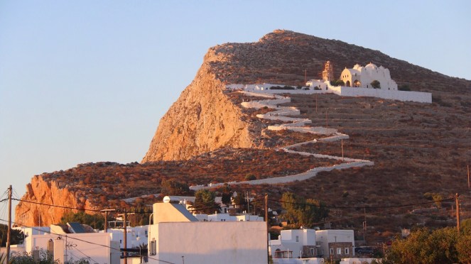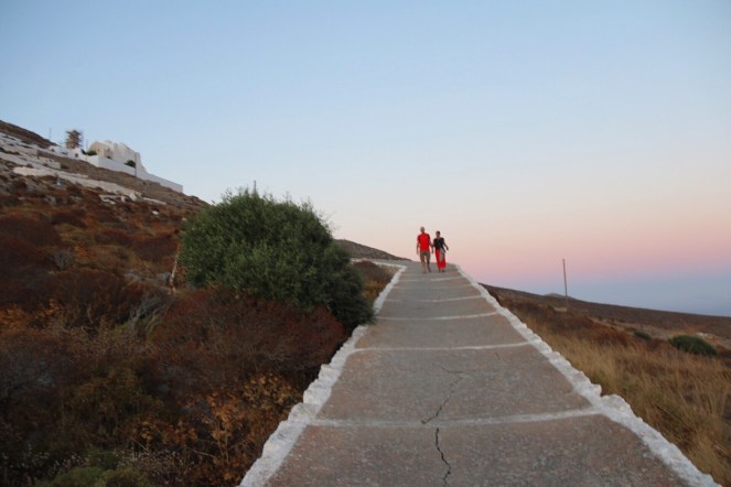 En sak som de flesta gör minst en gång under sin vistelse på Folegandros är att vandra stigen och trappan upp mot Panagiakyrkan, som ligger ovanför Chora, vid tiden för solnedgången.