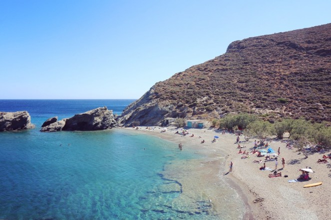 Agios Nikolaos var den enda stranden där vi hann bada under vårt korta besök. En vacker naturstrand utan solstolar och parasol men med några skuggande träd och en restaurang på platsen. Vi vandrade hit från Chora. Som ett alternativ kan du ta bussen till Angali och gå norrut längs vattnet därifrån. Vi valde istället att ta bussen tillbaka efter vårt eftermiddagsdopp i Medelhavet. Det kostade 2 Euro per person.