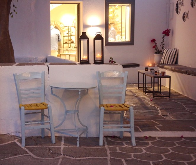Oavsett var på ön du väljer att bo så måste du bara, i alla fall någon gång, besöka Chora. Det är flera torg i byn. På torgen är det alldeles fullt av uteserveringar. Och hela byn är även i övrigt fantastiskt gullig. På kvällen är det nästan helt fullsatt på restaurangerna. Av den anledningen är det nästan mysigare att besöka byn vid lunchtid. Men kvällen har också sin särskilda charm.
