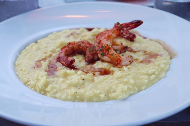 Första kvällen åt vi på Blue Cuisine som ligger lite i utkanten av Chora och där du, som vi, kan välja att sitta i deras lilla trädgård. Där serveras medelhavsmat med internationell touch och modernt snitt. Till förrätt tog vi in hårt bröd med tre olika dippsåser. Spännande och gott. Jag åt sedan en saffransrisotto som smakade bra och serverades i riklig mängd.