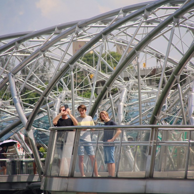 Istället för att gå på museum promenerar vi över en gångbro och vidare längs en kaj där vi ser vårt hotell dominera vyn på andra sidan vattnet. Gångbron som heter Helix Bridge är precis som allt annat här både snyggt designad och väl genomtänkt. Det spiralformade nät av stål och glasfiber som omger bron är både tänkt att ge skugga i den tropiska hettan och samtidigt föra tankarna till spiralformade DNA-molekyler. Längs gångbron finns flera plattformar, sannolikt redan från skiss-stadiet tänkta för att möjliggöra selfie-fotografering med Marina Bay Sands i bakrunden.