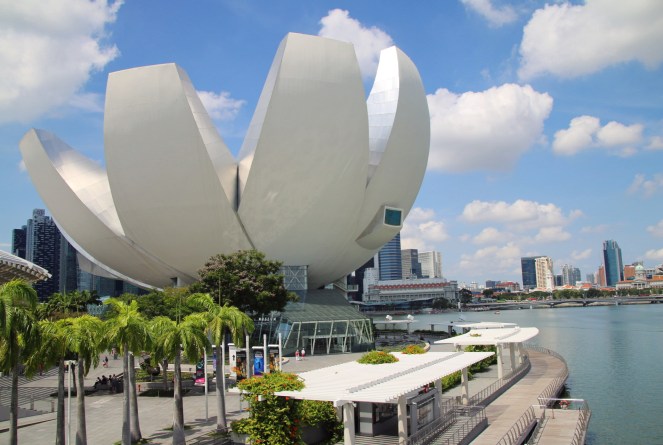 På förmiddagen delar vi på oss familjevis och min familj går en kortare sväng in mot stan. Direkt utanför vårt hotell finns ett vitt museum som har formen av vad som ska föreställa en lotusblomma. Det är ett museum tillägnat gränslandet mellan konst och vetenskap, media och teknologi samt design och arkitektur. Det heter ArtScience Museum. Det låter ju spännande men det är inget som vi känner att vi har tid för under vårt korta stopp här. Framför museet finns dammar med riktiga loutsblommor i mängder, som jag så klart inte kan låta bli att fotografera.