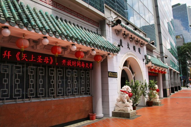 Efter en rundtur på Google kan jag i efterhand konstatera att templet vi var inne i heter Kheng Chiu Tin Hou Kong (琼州天后宫), och att det är dedikerat till den kinesiska sjöfartsgudinnan Mazu, och dessutom till Kheng Chiu Hwee Kuan (琼州会馆), den största hainanesiska klanen i Singapore.