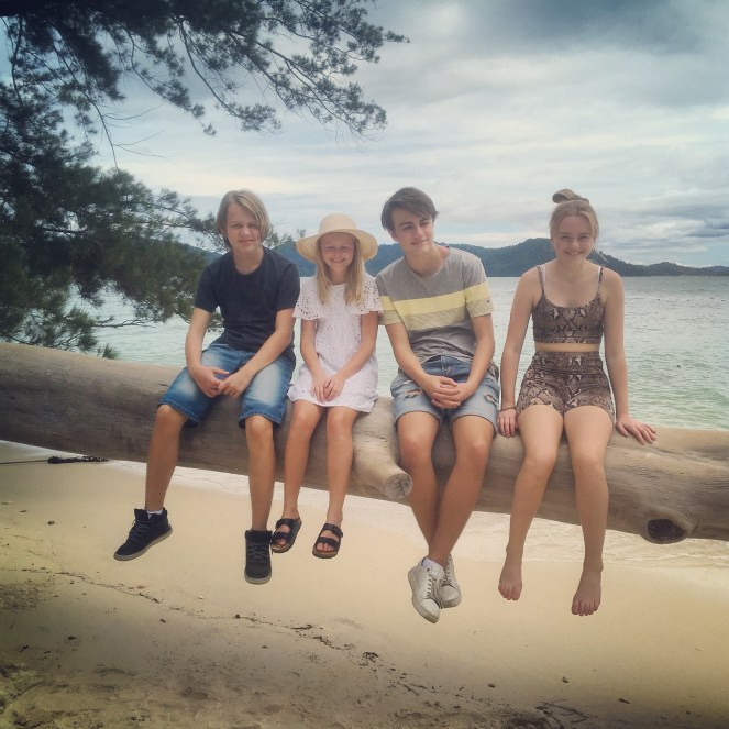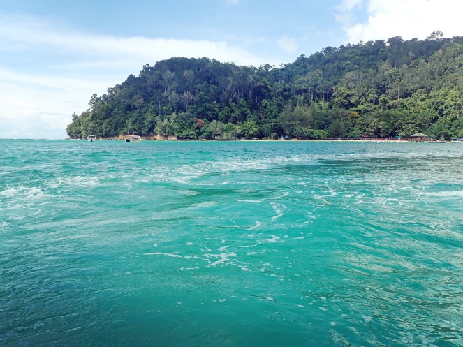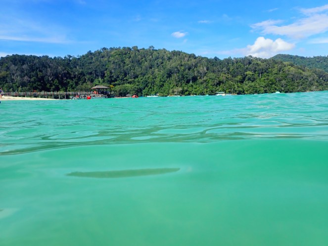Det är härligt att vara på väg ut på havet. Vindarna är ljumma. Vårt första stopp är vid ön Manukan. När vi går iland är det fullt av vad som ser ut att vara kinesiska turister som snorklar med flytvästar på sig, vid stranden till vänster om bryggan. Vi rekommenderades att istället gå till en strand som ligger ett stycke bort, åt höger. Efter att ha betalt entré för att besöka ön går vi till den strand som pekats ut åt oss. Det är en liten fin sandstrand med turkost vatten och en gunga vid vattnet. Under gungan ligger av någon anledning vad som ser ut att vara sandsäckar gjorda av vävd plast.