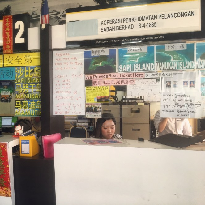 Mycket riktigt kommer de gåendes alldeles strax och jag går tillsammans med min svägerska in i väntsalen för att köpa båtbiljetter. Igen blir ljudvolymen öronbedövande och vi väljer det första, eller möjligen det andra biljettbåset till höger, direkt innanför dörren. En kvinna berättar om alternativen. Vi väljer att åka till två öar, Pulau Manukan och Pulau Sapi, med chatrad båt. Det betyder att vi bestämmer en tid när vi ska bli skjutsade från Manukan till Sapi och en tid när vi ska åka tillbaka. Jag får en biljett för fyra vuxna och fyra barn. Det är möjligt att hyra mask, snorkel och fenor men vi har med egen utrustning för att kunna se under vattenytan. (Mina pojkar använder hellre simglasögon än mask.)