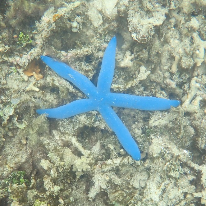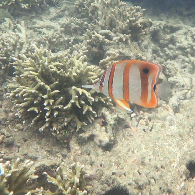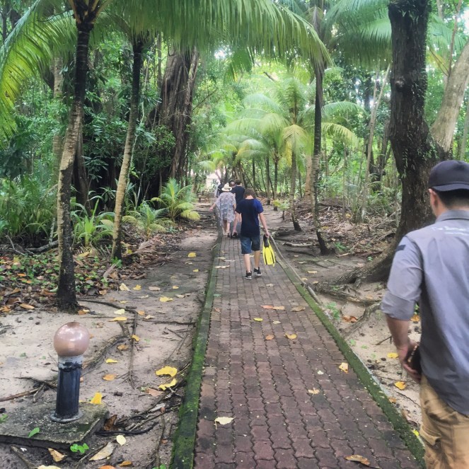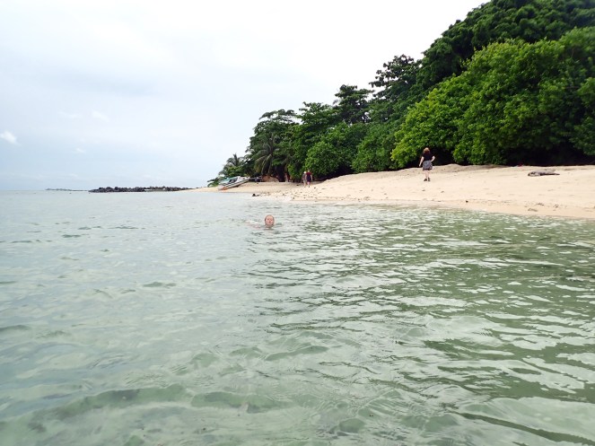 När vi är framme på ön får vi våra rum som är små och enkla, men rena, och serveras sedan lunch. Därefter är det tid för bad och snorkling. Tyvärr är vädret mulet den här dagen men snorklingen är bra.