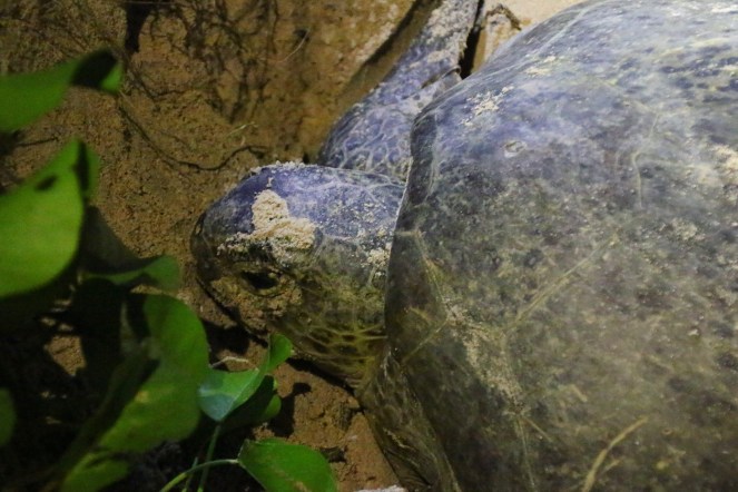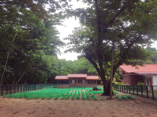 Vi får också veta att sköldpaddor kommer i land varje natt här, inte bara under vissa säsonger som på de flesta andra håll i världen, och att man därmed är i princip garanterad att se dem. Men vissa nätter kan det dröja långt in på småtimmarna innan den första kommer. Under högsäsongen (oktober) kommer upp till 50 sköldpaddor hit per natt för att lägga ägg och då hinner personalen långt ifrån ta hand om alla ägg. Många ägg får då ligga kvar där sköldpaddorna lagt dem. Nu har det precis hunnit bli november och antalet landningar per natt har redan avtagit något, berättar guiden vidare.