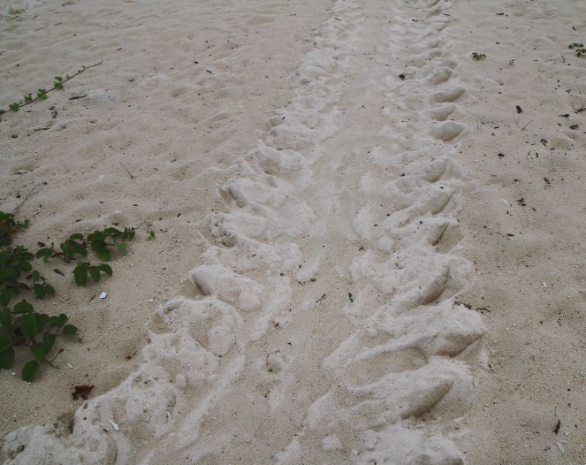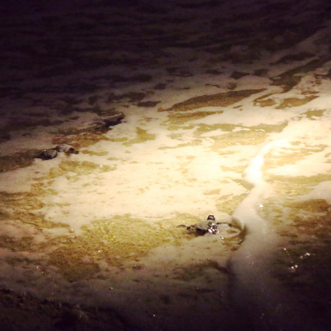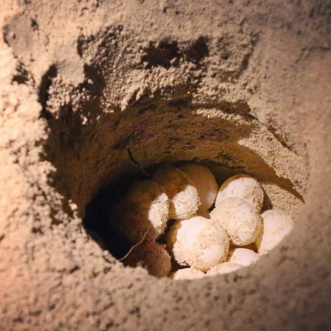 Guiden kommer in och berättar att kvällens första sköldpadda lägger ägg. Nu blir det bråttom. Vi skyndar efter guiden i mörkret. Gå snabbt, men inte springa. Det är inte helt enkelt. Men efter några minuter är vi framme vid sköldpaddan. En ”ranger”, naturvårdare som arbetar på anläggningen på ön, lyser med en ficklampa på äggen som sköldpaddan lägger. Vi har fått stränga tillsägelser att hålla oss bakom henne, att cirkulera så att alla får se och så att en person i varje familj får möjlighet att fotografera. Ingen videofilmning är tillåten.