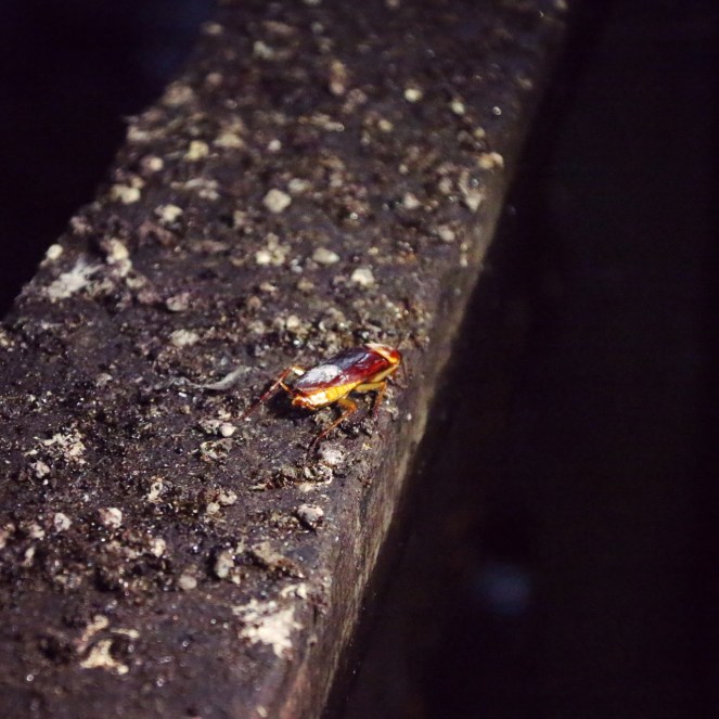 Det är nu som vi ser allt bajs från fladdermöss och svalor som täcker gångbroarna genom grottan, inklusive ledstänger. Det är också nu jag upptäcker insekterna. Möjligen är det kackerlackor?