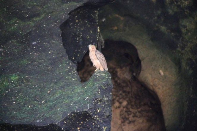 Men vi kliver alltså in i den grotta som kallas ”svart” därför att här skördas ”svarta” fågelbon. Direkt innanför ingången sitter en rovfågel en bit upp. Kanske en örn?