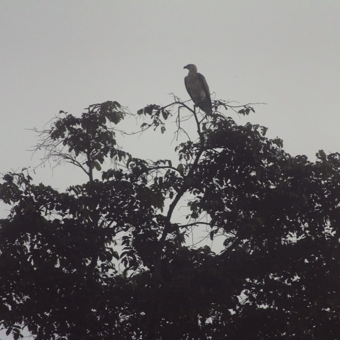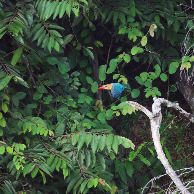 Den här gången går färden nedströms. Den här morgonens tur är tänkt att fokusera på fågellivet längs floden. Och så har vår guide fått med sig från oss att vi hoppas få se vild orangutang. Även om vi redan har sett en utanför en grotta, så vore det roligt att få se mer av dessa våra nära släktingar.