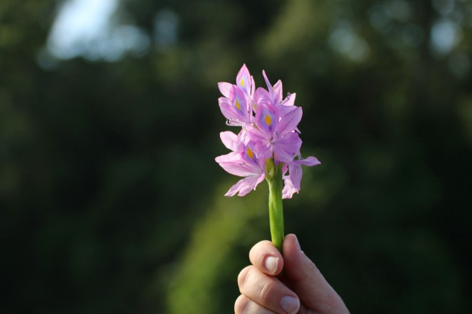 Vattendraget vidgas och vi befinner oss i en sjö. Det är en korvsjö som invaderats av blå blommor från Sydamerika, som inte hör hemma här, men som myndigheterna nu gett upp hoppet om att en dag lyckas utrota från dessa trakter. De togs en gång hit som föda till grisar och nu är de överallt. Men vackra är de trots att de betraktas som ogräs och inte borde vara här. Vattenhyacint kallas de på svenska och namnet är mycket träffande.